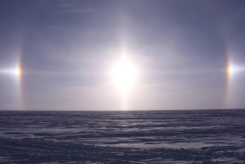 幻日(sun dogs)是大氣的一種光學現象。在天空出現的半透明薄云里面,有許多飄浮在空中的六角形柱狀的冰晶體,偶爾它們會整整齊齊地垂直排列在空中。當太陽光射在這一根根六角形冰柱上,就會發生非常規律的折射現象。