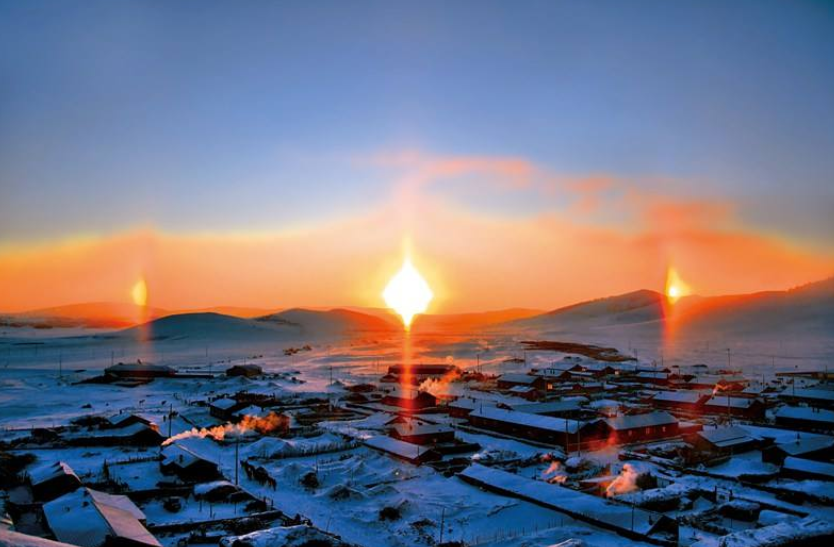 對此,河北省氣象局氣象學家這樣解釋:這是由于團霧引起的折射,是一種“幻日”現象,因為在團霧里有許多飄浮在空中的柱狀冰晶體,從光學角度講,就像是一個多棱鏡,當太陽光射在這冰晶體上時,就會發生非常規律的折射,所以我們能看到“兩個太陽”。