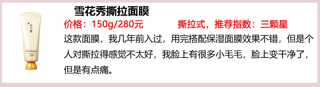 幾年前入過(guò)雪花秀撕拉面膜,對(duì)有黑頭的皮膚比較友好,用完會(huì)有臟東西粘下來(lái),再搭配保濕面膜,效果更好。