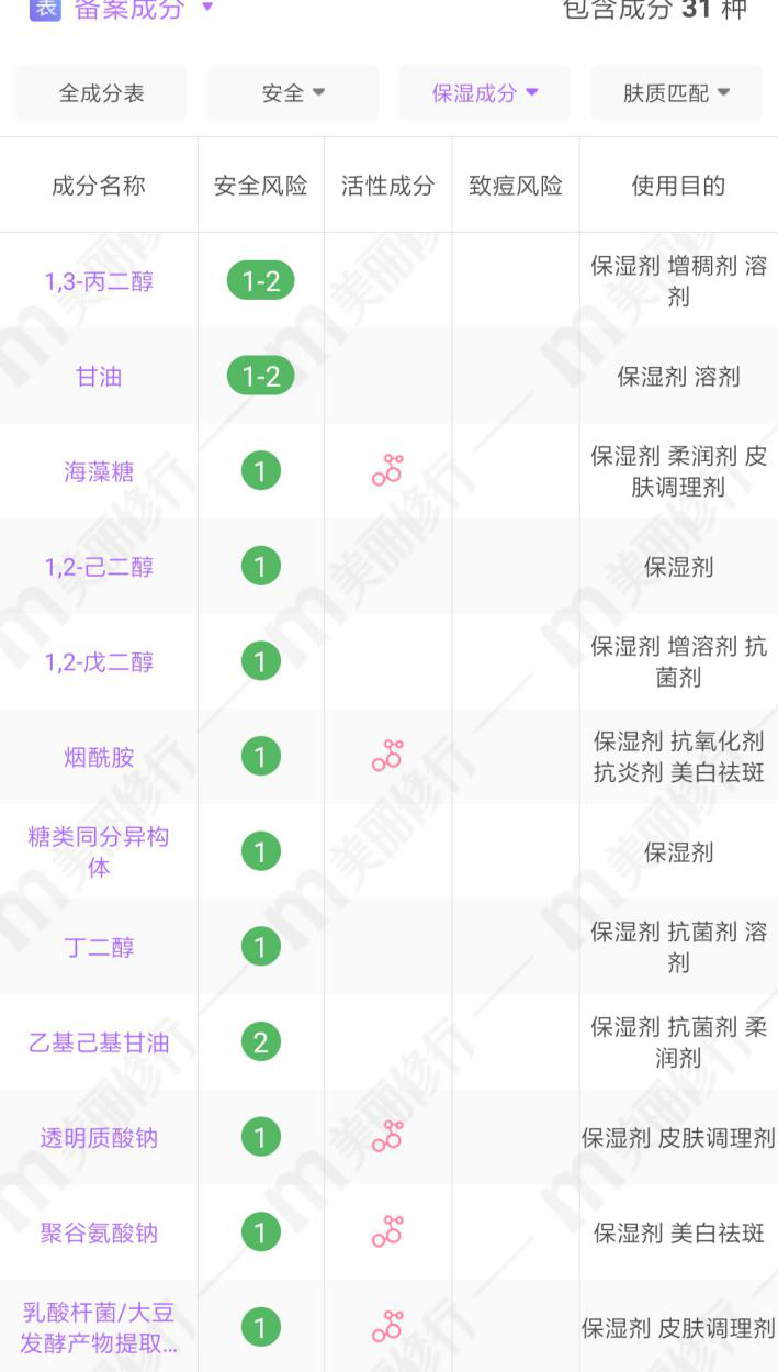 它有5種活性成分,保濕能力超強。其中的煙酰胺我非常喜歡,它除了保濕、控油的基礎功能外,還有抗糖基化的功能,可以幫助皮膚保持活性,延緩老化。