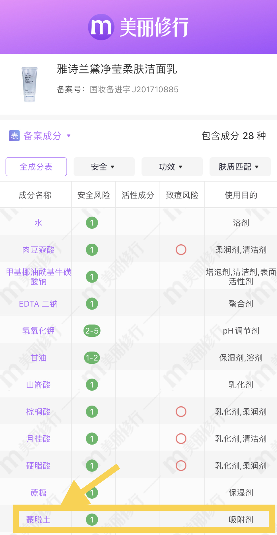 主要成分和他們家洗面奶一樣是蒙脫土,蒙脫土很多人可能不清楚,它是一種火山凝灰巖風化后的產物,具很強的吸附力和陽離子交換性,很安全,孕婦也可以用,雅詩蘭黛的凈瑩柔膚潔面乳使用的也是這種成分。