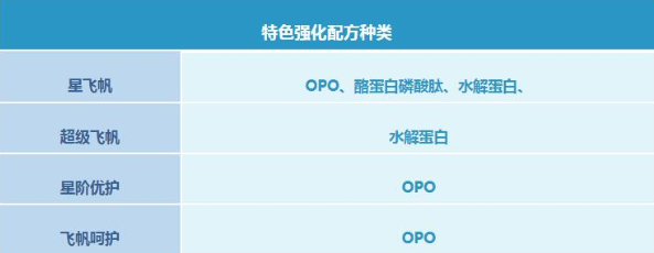 在特色強化配方種類方面,星飛帆添加的會比其他三類要多,而酪蛋白磷酸肽能有效促進寶寶對鈣、鐵、鋅等二價礦物營養素的吸收;水解蛋白可以提高寶寶對蛋白質的吸收。
