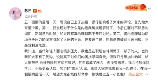 爭議發生后,蘇芒在3日正式道歉,她表示,“第一,我發現對于什么是內卷我確實理解錯了。今后在面對不熟悉的詞匯,新詞意的時候,如果沒有真的理解就不開口討論。第二,將內卷理解為職場競爭壓力的發言引起了大家的不適,也要道個歉,原意是想鼓勵大家積極,不是想制造焦慮。”