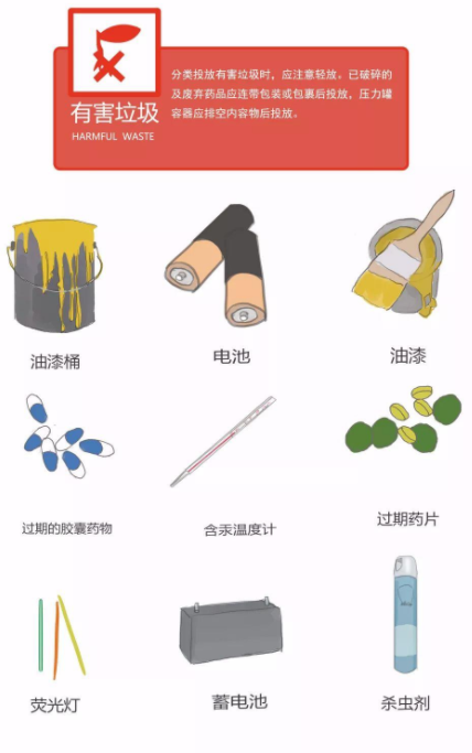 常見包括廢電池、廢熒光燈管、廢燈泡、廢水銀溫度計(jì)、廢油漆桶、過期藥品、過期化妝品等。有害有毒垃圾需特殊正確的方法安全處理。