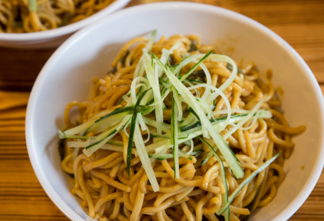 食材明細:面條、芝麻醬、綠豆芽、黃瓜、胡蘿卜、雞蛋、蒜、香蔥、油炸花生米、鹽、雞汁、白糖、香醋。